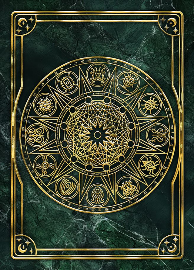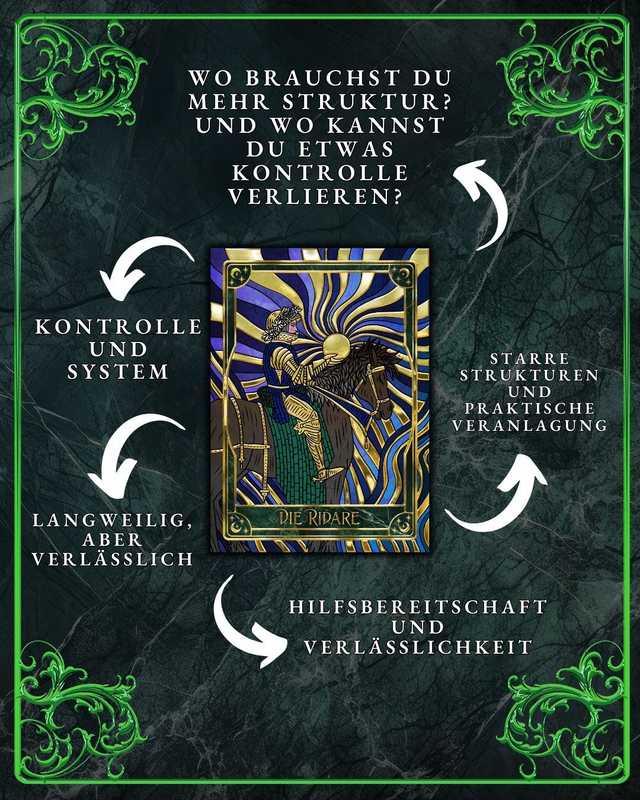 Postkarte mit abgerundeten Ecken und 3D-Goldlack in Tarotkarten-Optik auf der Vorderseite. Die Rückseite ist ohne Goldlack.